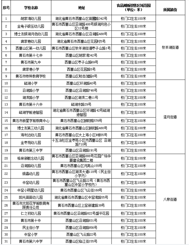 西塞山区校园周边食品摊贩禁售区域范围明细表