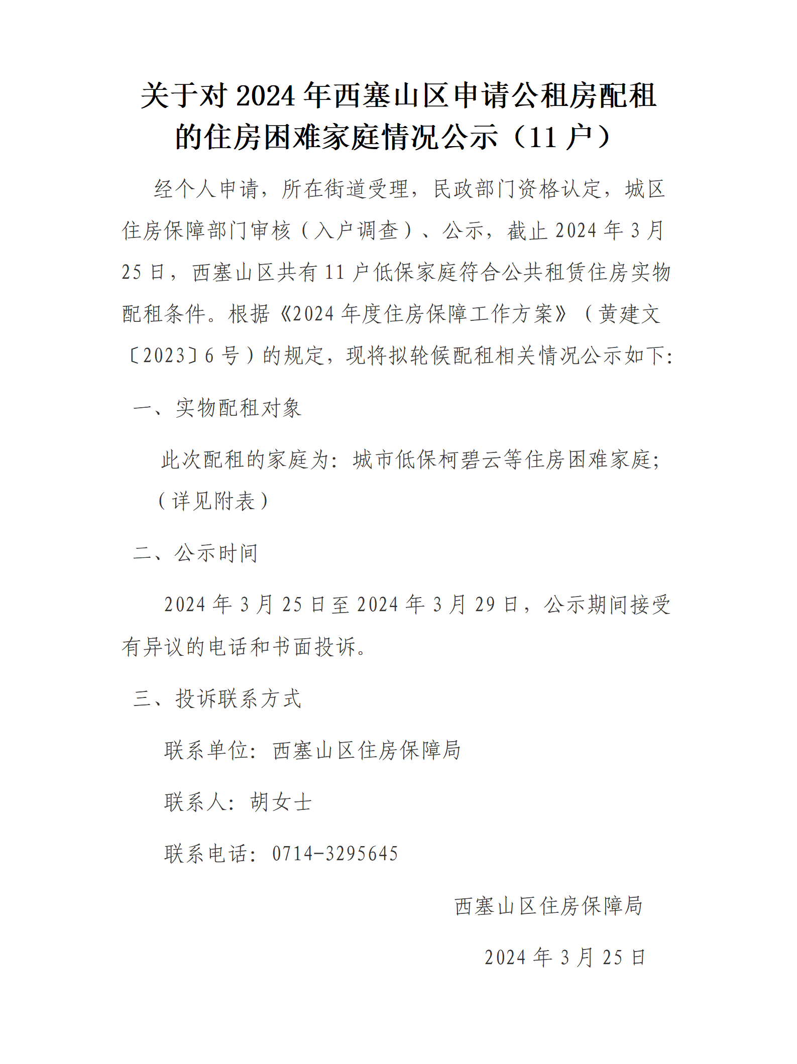 关于对2024年西塞山区申请公租房配租的住房困难家庭情况公示(11户)