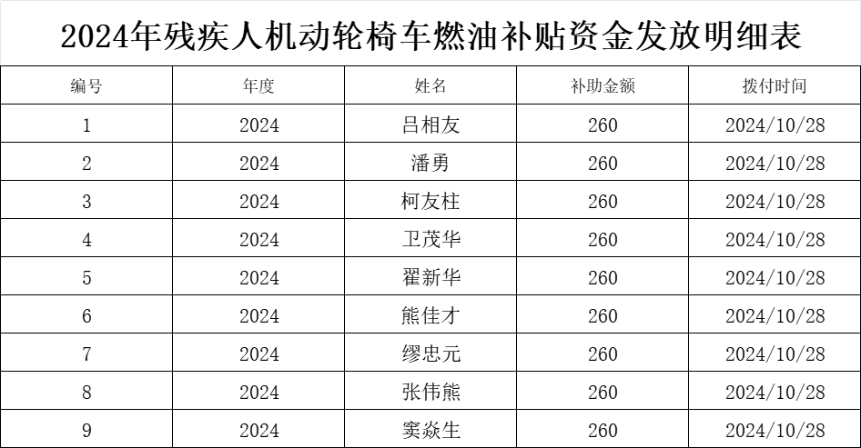 2024年残疾人机动轮椅车燃油补贴资金发放明细表