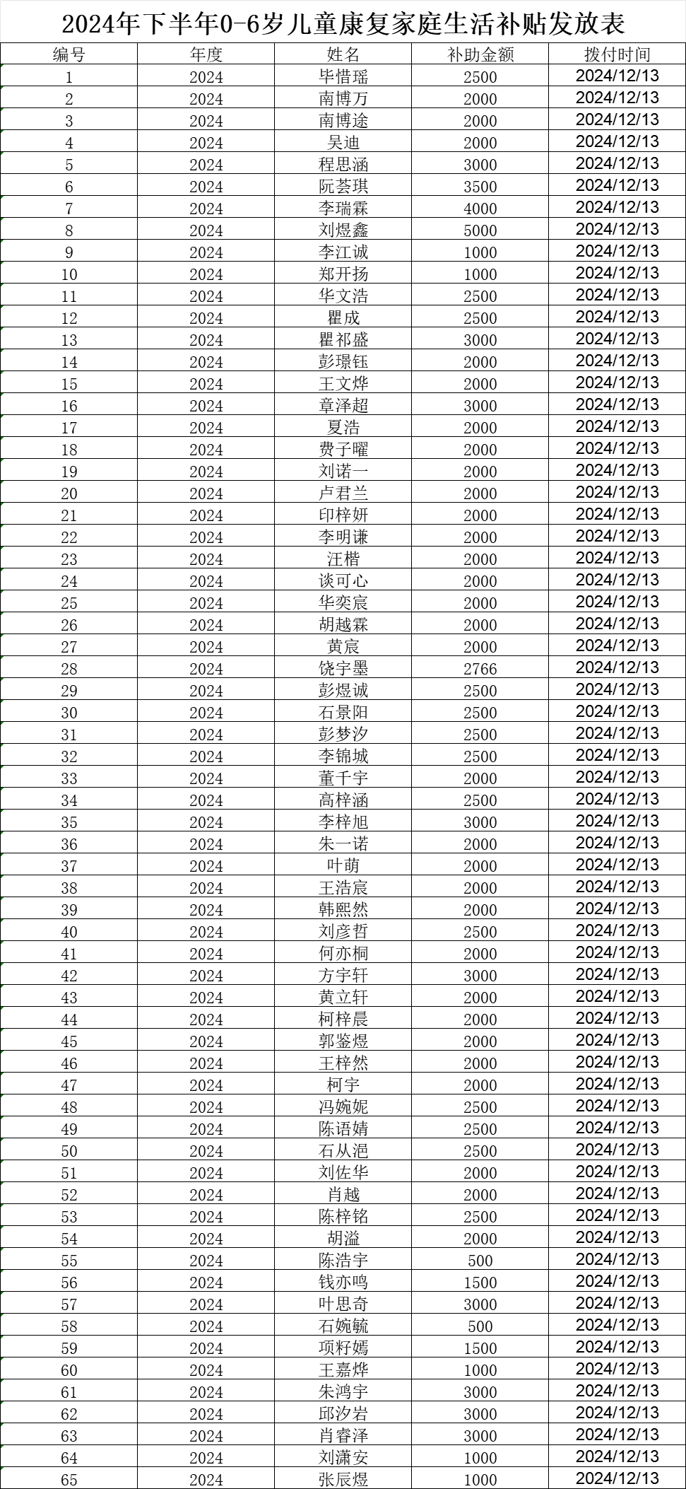 2024年下半年0-6岁儿童康复家庭生活补贴发放表