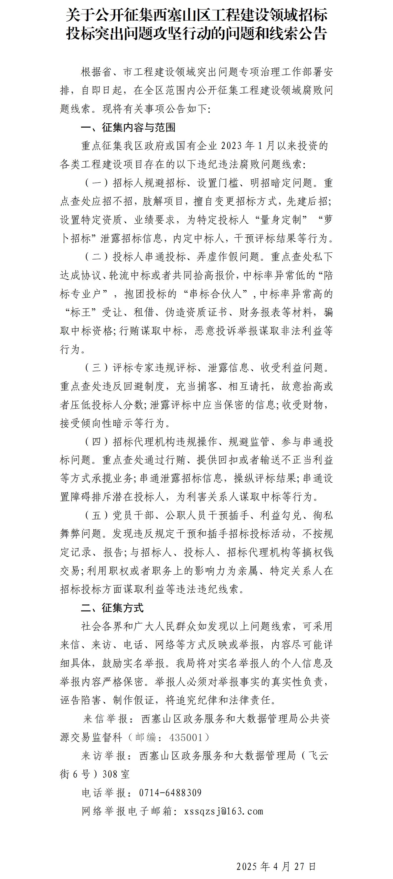 关于公开征集西塞山区工程建设领域招标投标突出问题攻坚行动的问题和线索公告