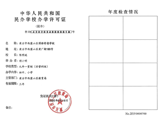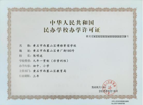 办学规模:黄石市西塞山区博雅寄宿学校是由黄石国资公司招商引资,经西塞山区教育局批准设立的区内唯一一所九年一贯制民办中小学。学校现有教学班12个,在校学生337人,在职教职工53人。