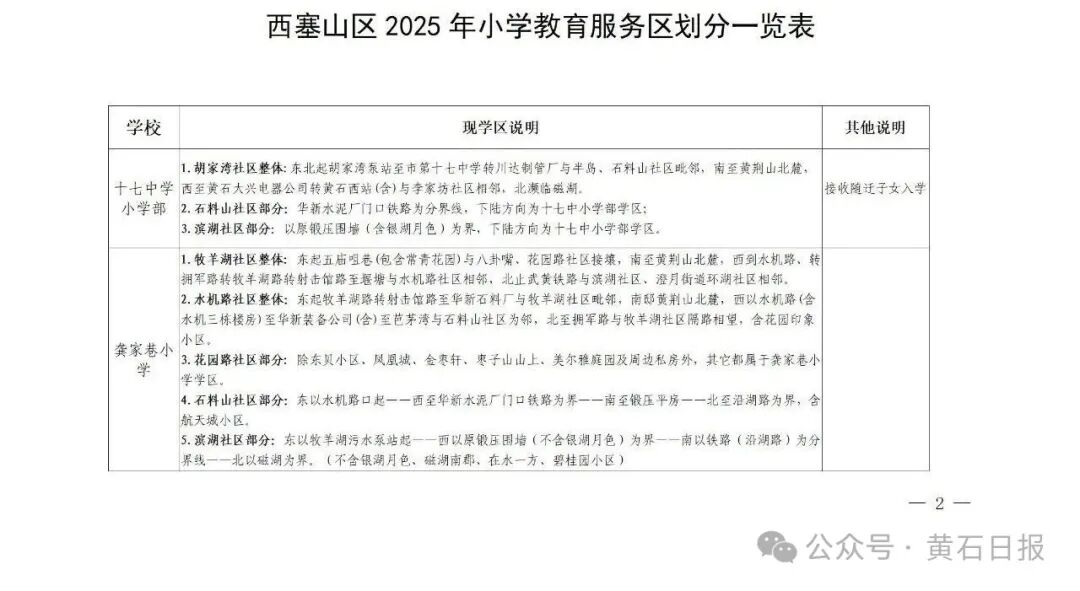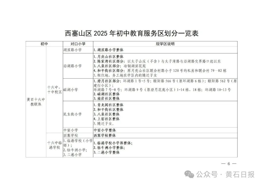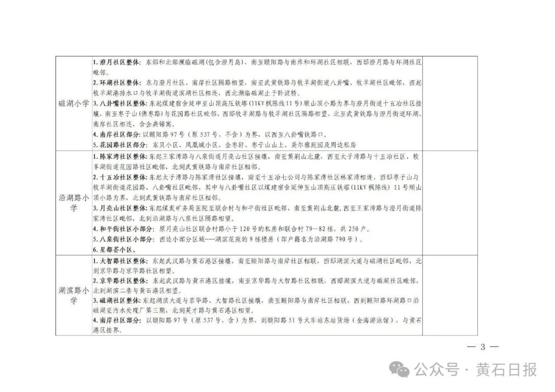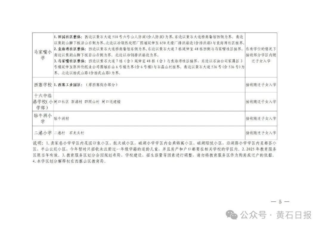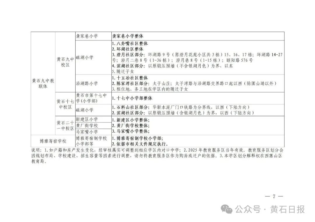 2、设立流动人口和进城务工随迁子女入学定点学校:黄石十六中教联体十六中临港学校、黄石九中教联体黄石市十七中学、黄石九中教联体黄石市二十一中学、黄石市龚家巷小学教联体黄石市磁湖小学、黄石市龚家巷小学教联体黄石市中窑小学、黄石市沿湖路小学教联体黄石市民主街小学、黄石市沿湖路小学教联体黄石市黄厂街学校、黄石市湖滨路小学教联体黄石市马家嘴小学、黄石市湖滨路小学教联体黄石市西塞学校等9所公办中小学。