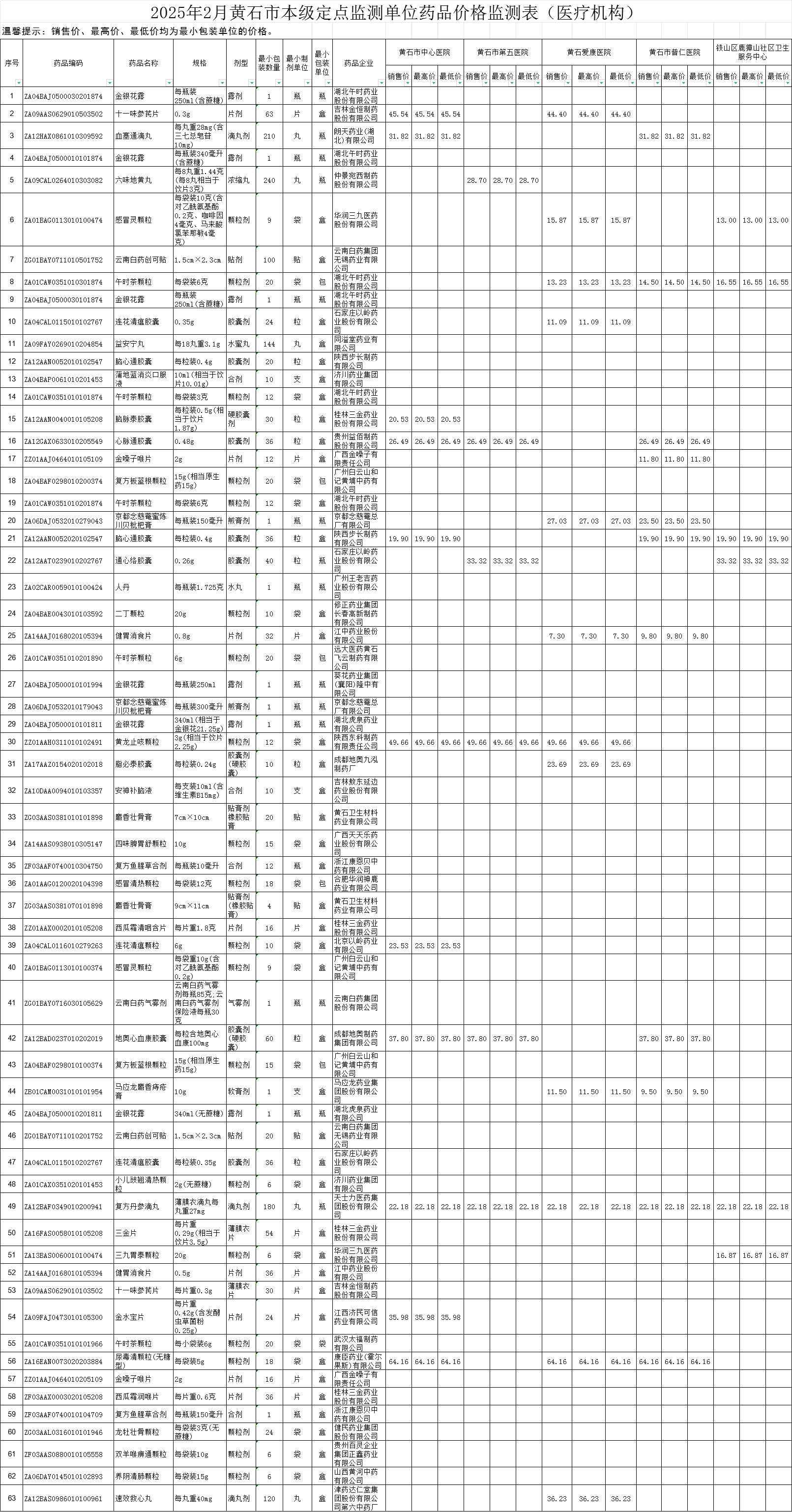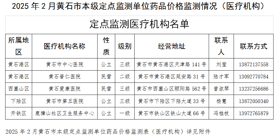 2025年2月黄石市本级定点监测单位药品价格监测情况(医疗机构)