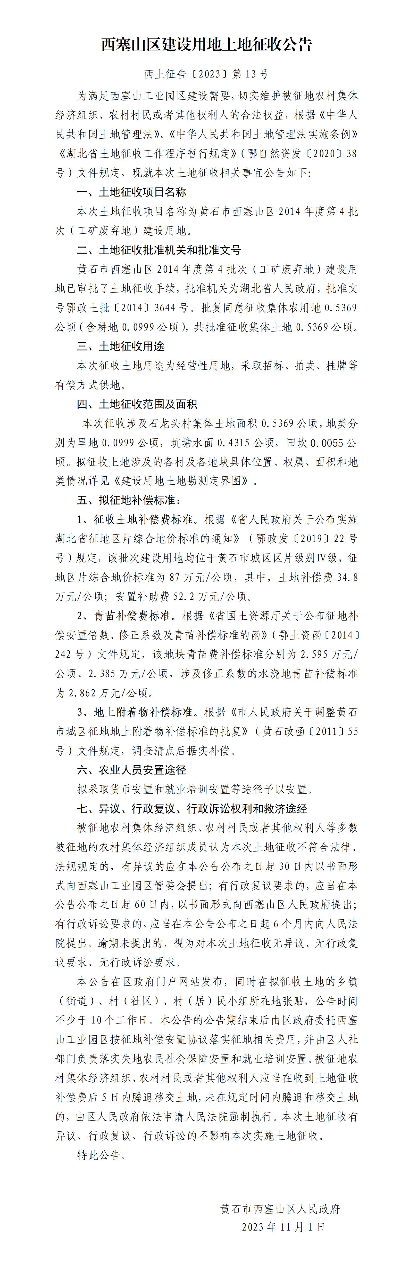 西塞山区建设用地土地征收公告(西土征告〔2023〕第13号)