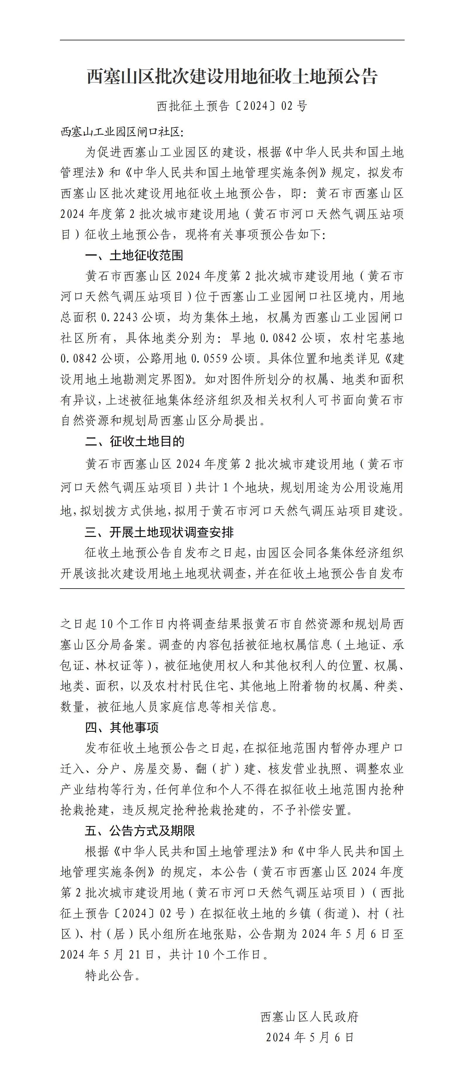西塞山区批次建设用地征收土地预公告(西批征土预告〔2024〕02号)