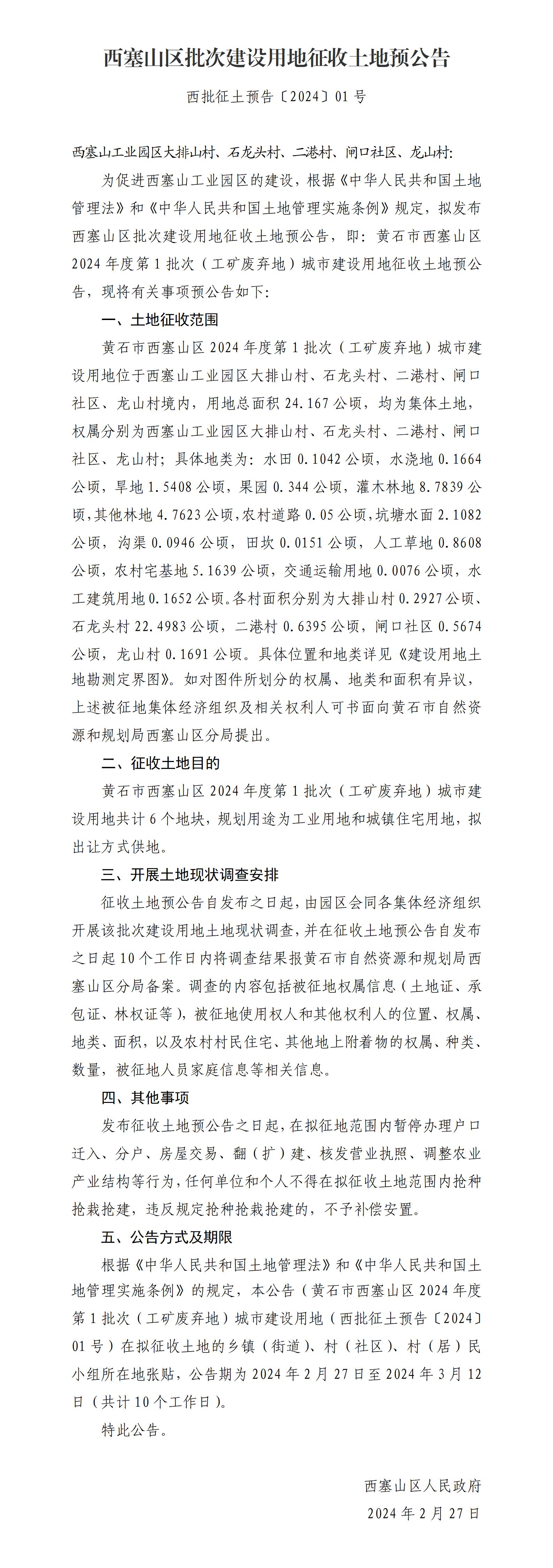 西塞山区批次建设用地征收土地预公告(西批征土预告〔2024〕01号)