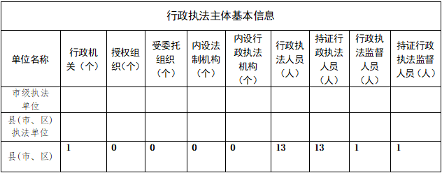 说明:市级行政执法单位填表格中的第1、2行数据,统计本单位和县(市、区)执法单位情况;县(市、区)司法局填表格中的第3行数据,汇总本级行政执法单位和乡镇(街道)情况。