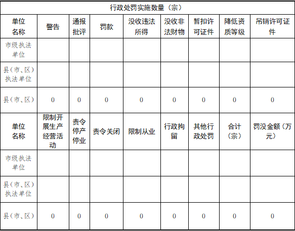 1.行政处罚实施数量的统计范围为统计年度1月1日至12月31日期间作出行政处罚决定的数量。2.单处一个类别行政处罚的,计入相应的行政处罚类别;并处两种以上行政处罚的,算一宗行政处罚,计入表格排序在后的行政处罚类别。如“没收违法所得,并处罚款”,计入“没收违法所得”类别;并处明确类别的行政处罚和其他行政处罚的,计入明确类别的行政处罚,如“处罚款,并处其他行政处罚”,计入“罚款”类别。行政处罚类别表格排序:(1)警告;(2)通报批评;(3)罚款;(4)没收违法所得;(5)没收非法财物;(6)暂扣许可证件;(7)降低资质等级;(8)吊销许可证件;(9)限制开展生产经营活动;(10)责令停产停业;(11)责令关闭;(12)限制从业;(13)行政拘留;(14)其他行政处罚。3.“没收非法财物”能通过评估、拍卖等手段确定金额的,计入“罚没金额”;不能确定金额的,不计入“罚没金额”。4.“罚没金额”以处罚决定书确定的金额为准。
