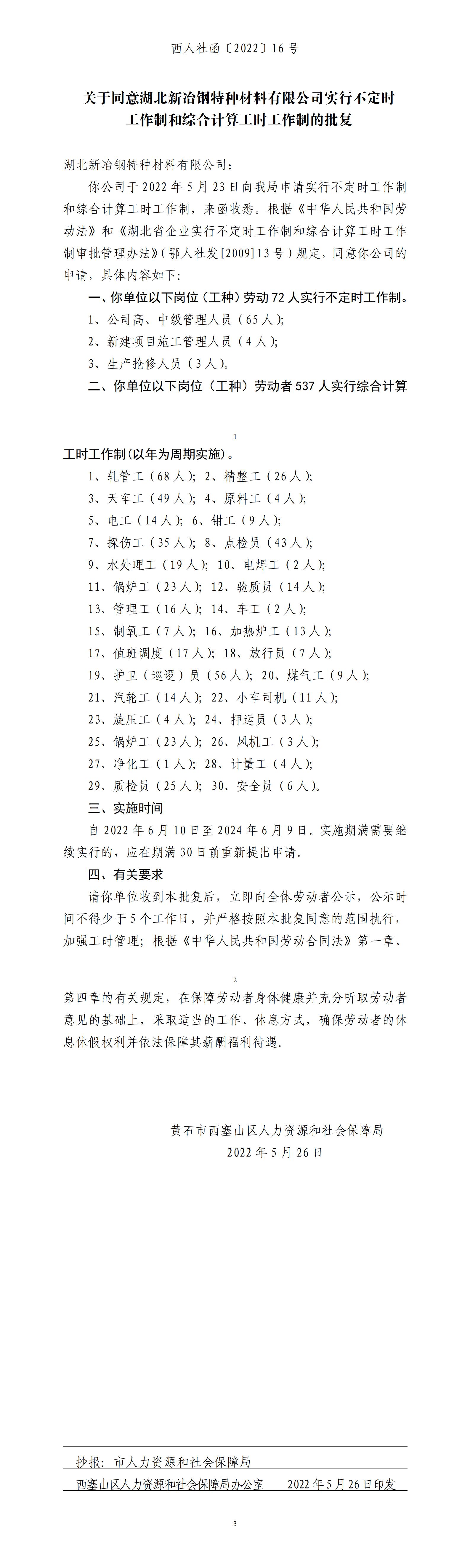关于同意湖北新冶钢特种材料有限公司实行不定时工作制和综合计算工时工作制的批复