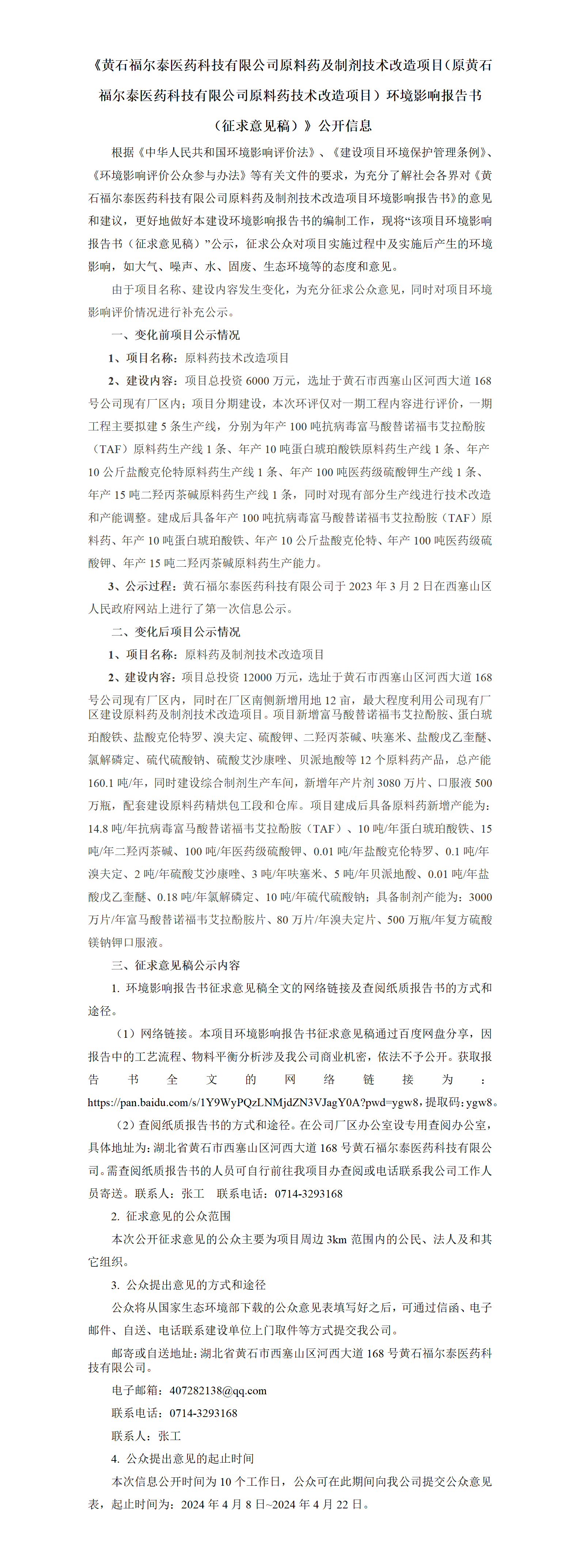 《黄石福尔泰医药科技有限公司原料药及制剂技术改造项目(原黄石福尔泰医药科技有限公司原料药技术改造项目)环境影响报告书(征求意见稿)》公开信息