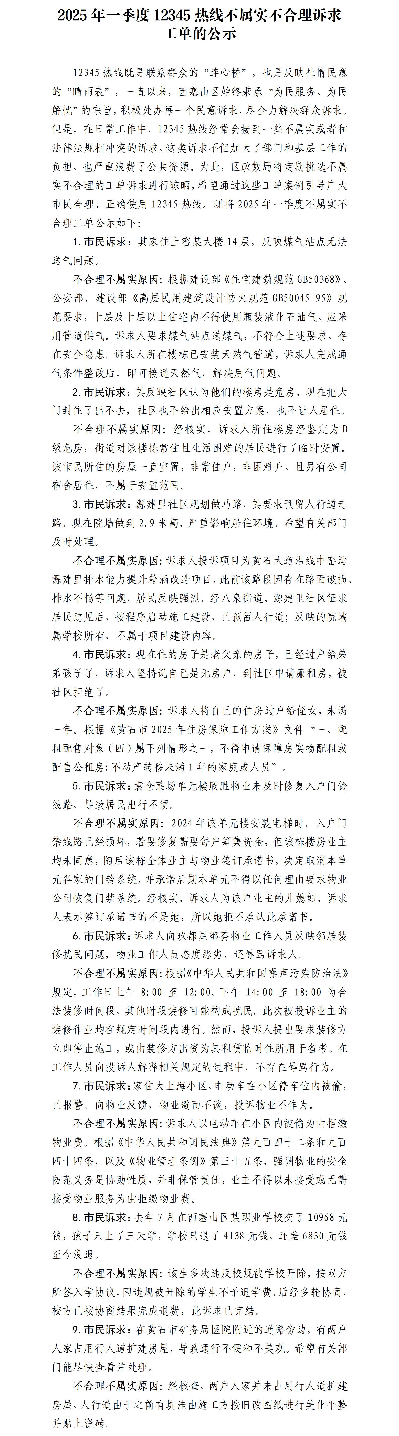 2025年一季度12345热线不属实不合理诉求工单的公示