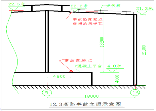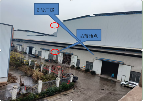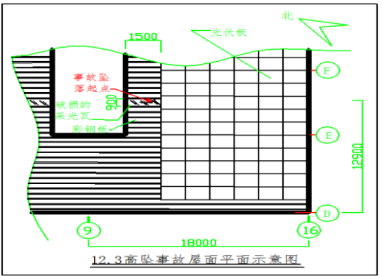 2号厂房呈东北至西南走向,屋顶中部设置气楼,气楼两边为坡屋面,屋脊高22.5m、屋檐高21.3m,檩条呈东北方向安装于屋顶钢结构上,屋面彩钢板和采光瓦呈东南方向固定于檩条上,相邻两根檩条之间间距1.4m;厂房内停产,主要闲置一台中频炉及其操作平台,存放一些模具和钢材等物件。事故发生地点位于屋顶气楼东南面光伏板安装施工现场及其下方中频炼钢炉操作平台,坠落高度差18.2m。(见事故现场平面、立面示意图及事故现场照片1、2)
