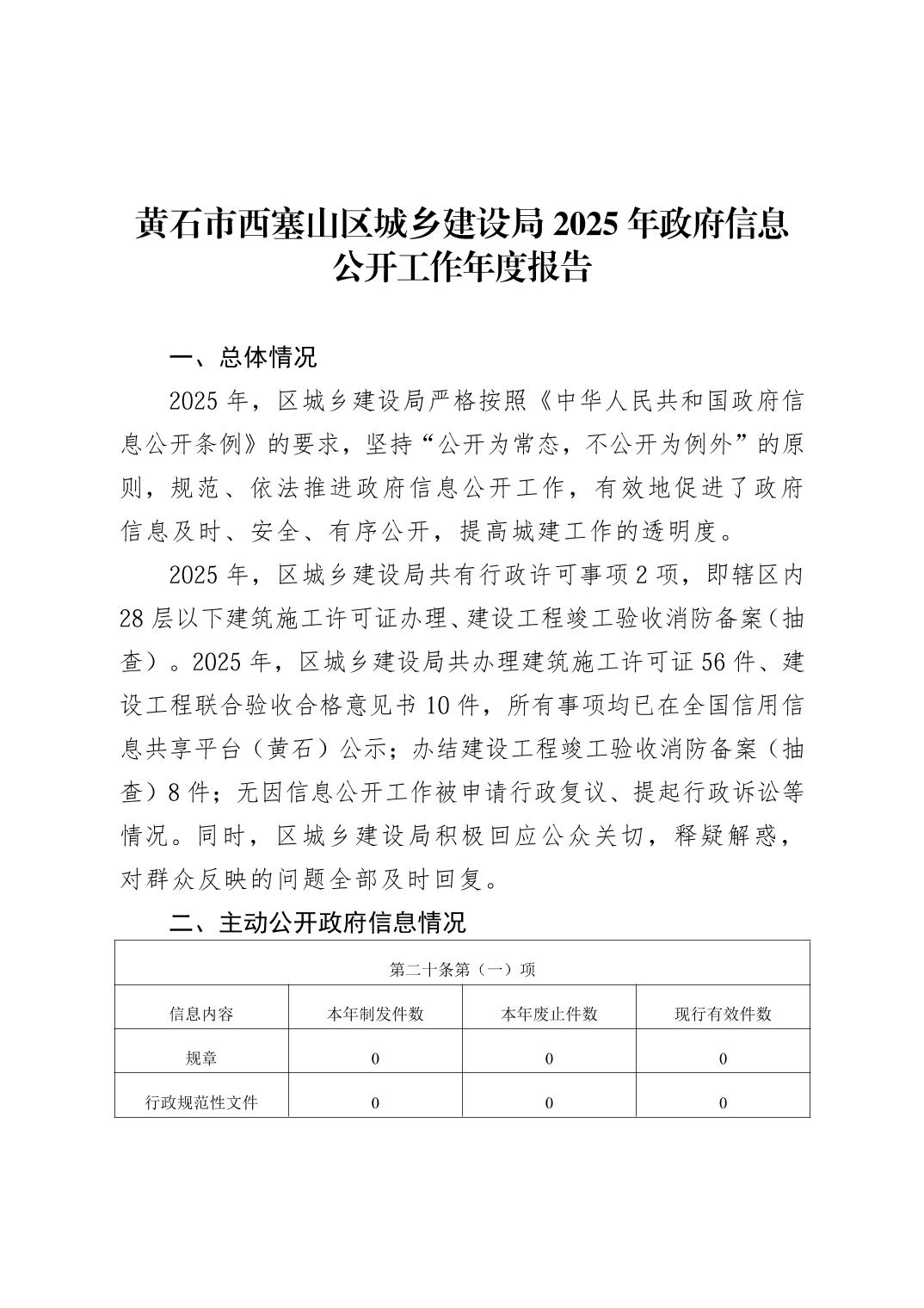 西塞山区城乡建设局2025年政府信息公开工作年度报告