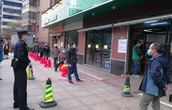 在卫斌超市门口,社区调配10名党员志愿者分两班参与维持现场秩序,店外每间隔1.5米,放置1个小红凳,为排队群众提供休息。志愿者还为没有手机的老人提供代买服务。