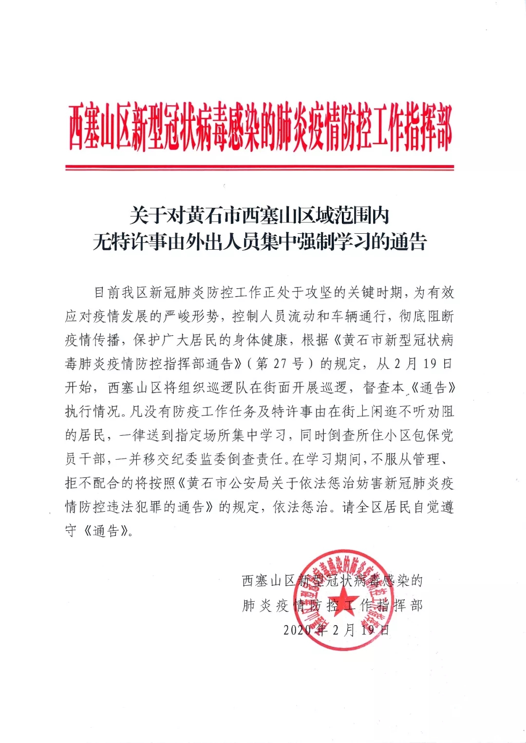 目前我区新冠肺炎防控工作正处于攻坚的关键时期,为有效应对疫情发展的严峻形势,控制人员流动和车辆通行,彻底阻断疫情传播,保护广大居民的身体健康,根据《黄石市新型冠状病毒肺炎疫情防控指挥部通告》(第27号)的规定,从2月19日开始,西塞山区将组织巡逻队在街面开展巡逻,督查本《通告》执行情况。凡没有防疫工作任务及特许事由在街上闲逛不听劝阻的居民,一律送到指定场所集中学习,同时倒查所住小区包保党员干部,一并移交纪委监委倒查责任。在学习期间,不服从管理、拒不配合的将按照《黄石市公安局关于依法惩治妨害新冠肺炎疫情防控违法犯罪的通告》的规定,依法惩治。请全区居民自觉遵守《通告》。