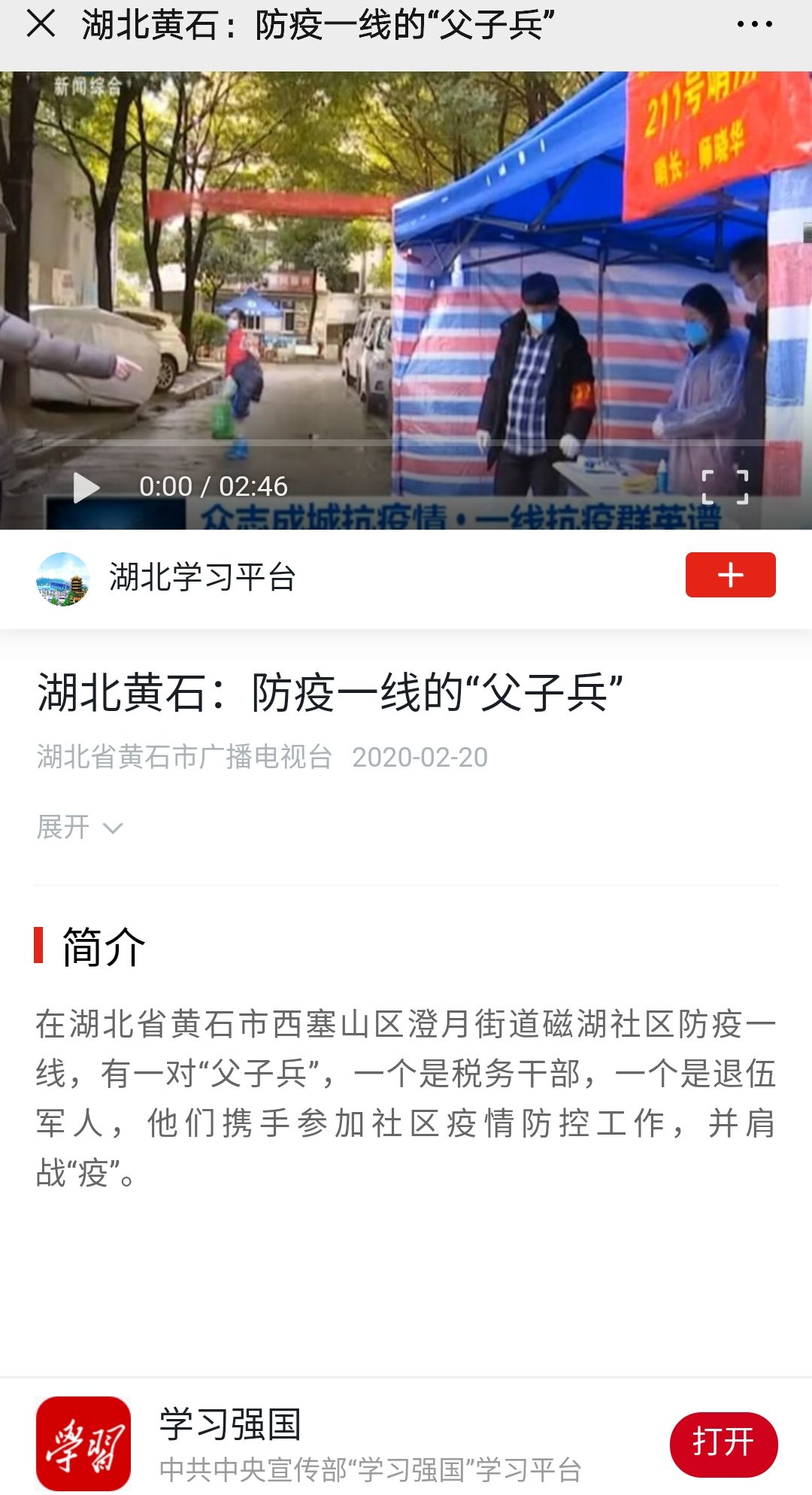 在西塞山区澄月街道磁湖社区防疫一线,有这样的一对“父子兵”,他们一个是税务干部,一个是退伍军人,携手并肩参加疫情防控工作,全心守护人民群众的身体健康。2月20日,“学习强国”平台刊登了这对“父子兵”的事迹。