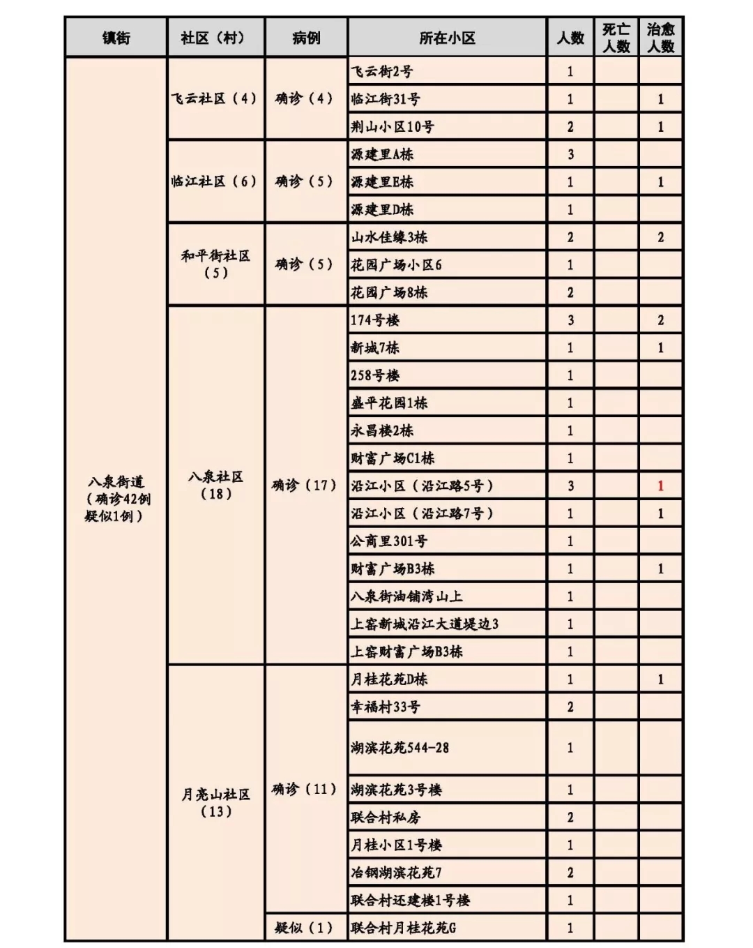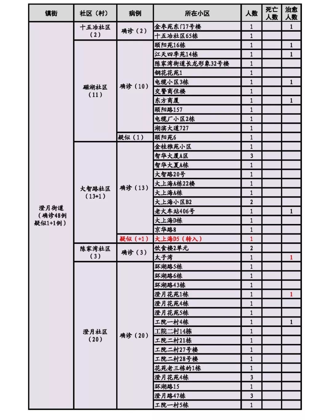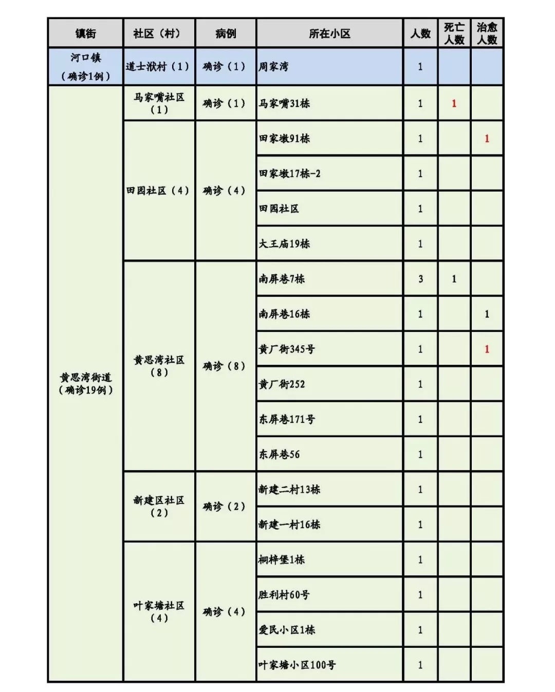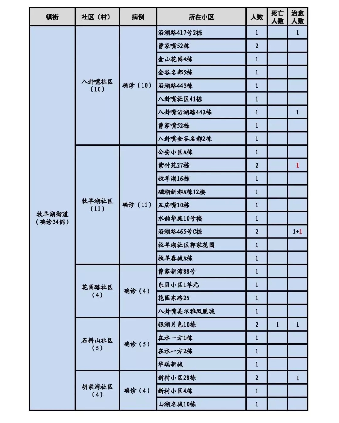 新增出院7人,其中,八泉街道1人,澄月街道2人,黄思湾街道2人,牧羊湖街道2人。累计出院31人。新增死亡1 人,累计死亡3人。