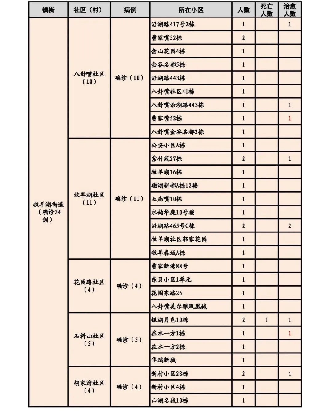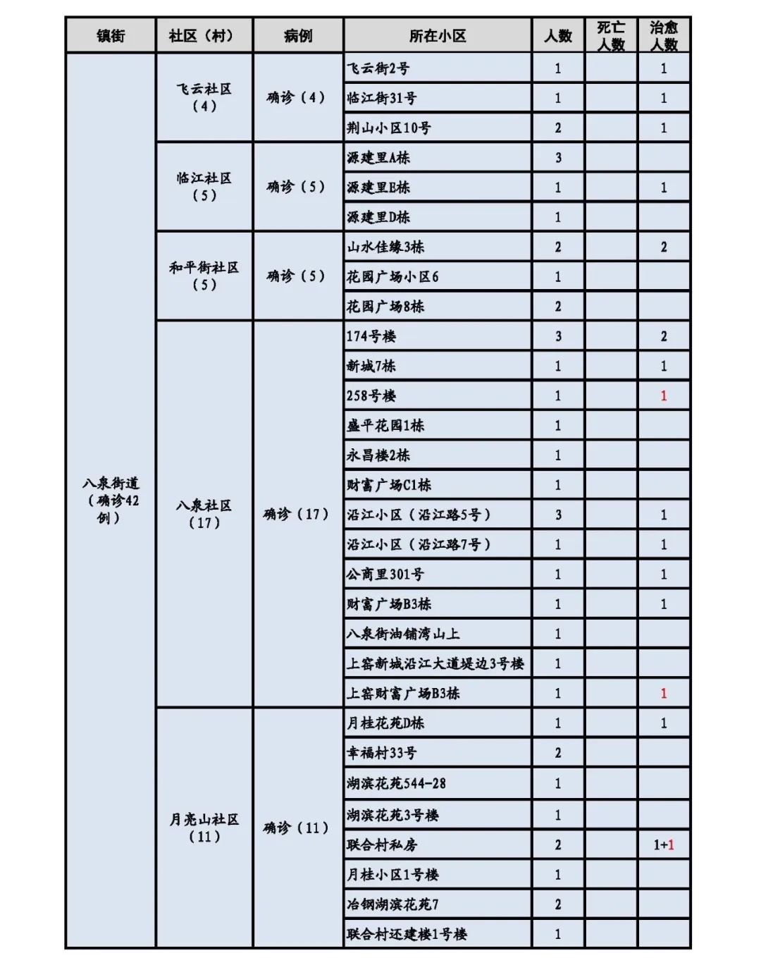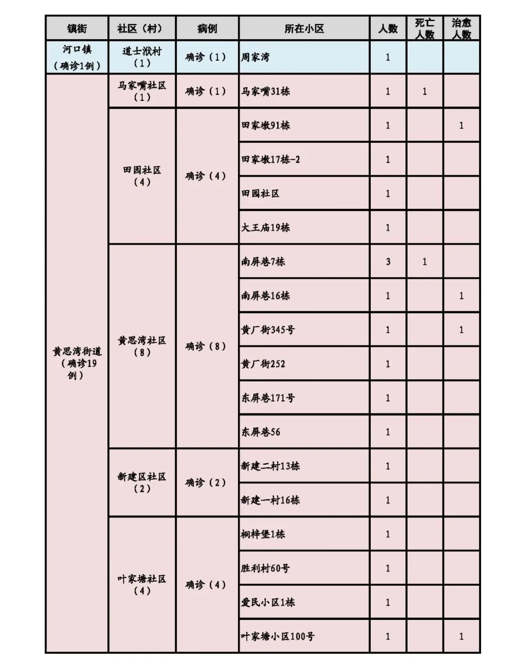 2月22日0时—24时,我区新增确诊病例0人。累计确诊145人。其中,河口镇1人,黄思湾街道19人,八泉街道42人,澄月街道49人,牧羊湖街道34人。新增出院8人,其中,八泉街道3人、澄月街道3人、牧羊湖街道2人。累计出院46人。累计死亡3人。