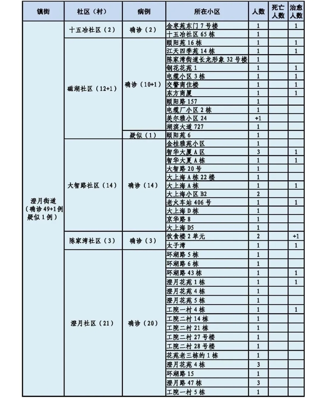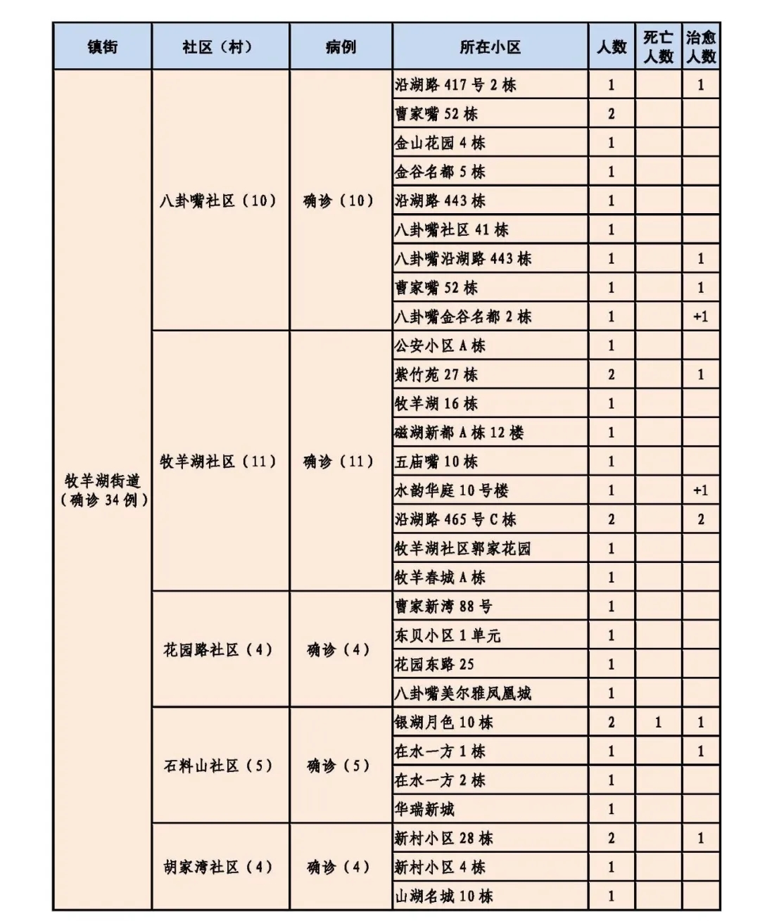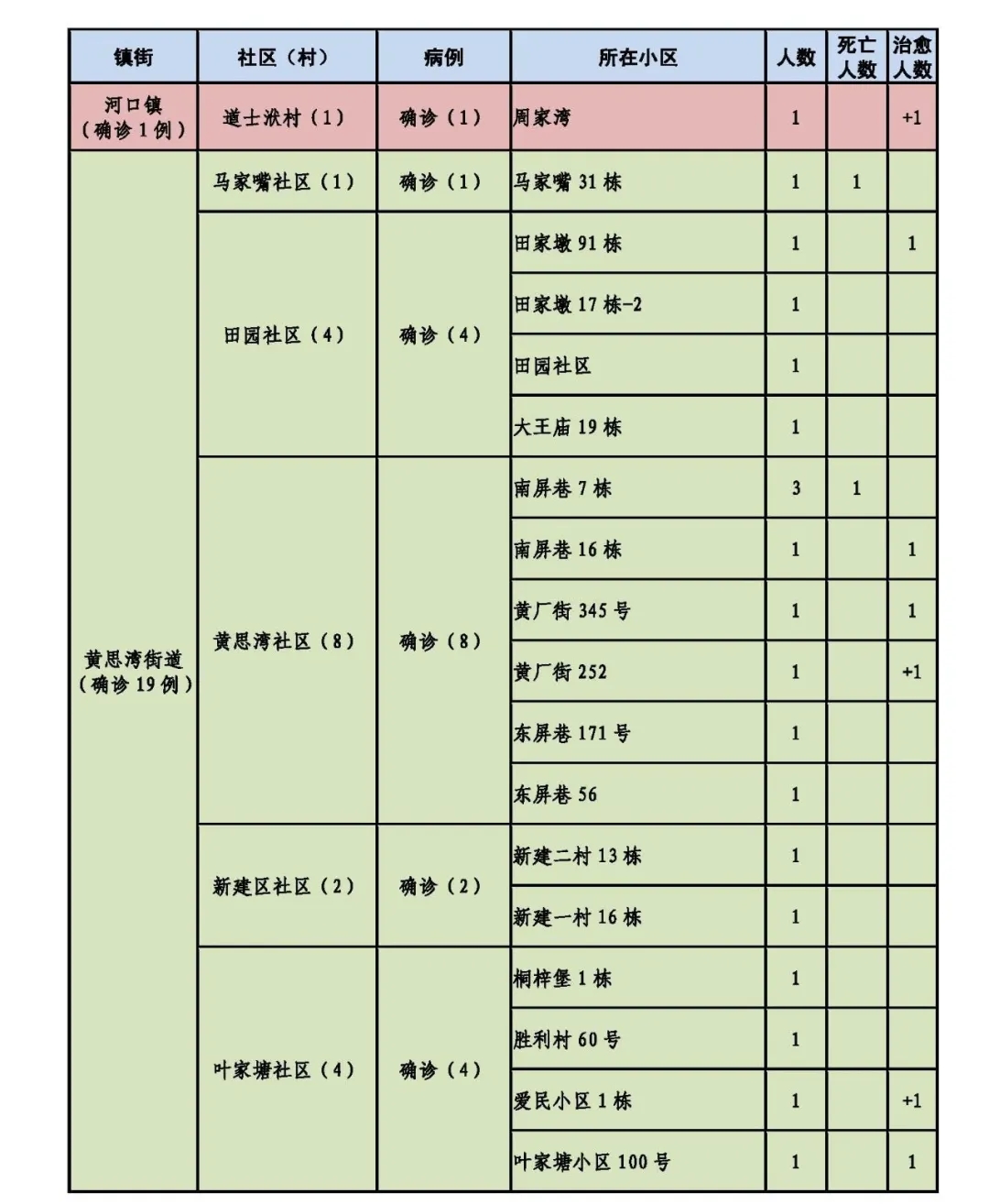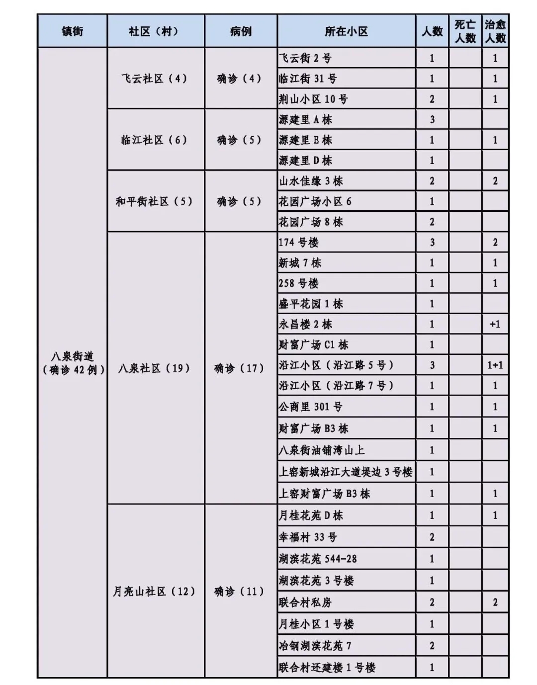 新增出院8人,其中,八泉街道2人、澄月街道1人、牧羊湖街道2人、黄思湾街道2人、河口镇1人。累计出院53人。累计死亡3人。